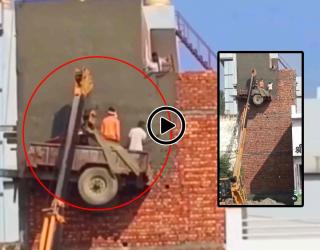 VIDEO: भन्नाट जुगाड! JCB ला ट्रॉली लटकवून मजुरांनी तिसऱ्या मजल्यावर केलं भिंतीला प्लास्टर