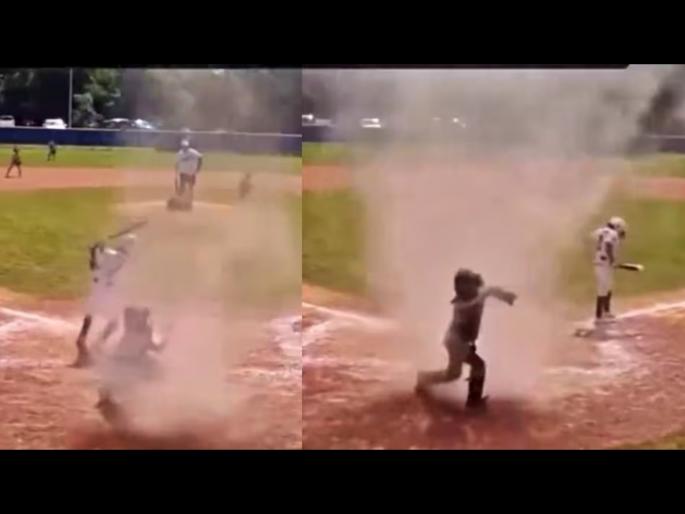 सोशल मीडियावर या घटनेचा व्हिडीओ व्हायरल झाला आहे. यात तुम्ही बघू शकता की, लहान मुलांची बेसबॉल मॅच सुरू आहे. यादरम्यान मैदानात चक्रीवादळ येतं. यावेळी बॅटींग करणारा मुलगा बाजूला होतो, पण किपिंग करणारा मुलगा या वादळात अडकतो. तेव्हाच अपांयर लगेच धावत जाऊन त्या मुलाला वादळातून बाहेर काढतो.