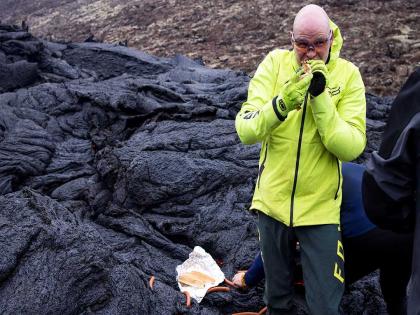 आइसलॅंडमध्ये ६ हजार वर्षापासून शांत असलेल्या एका ज्वालामुखीचा उद्रेक झाला आहे. हा नजारा बघण्यासाठी तिथे हजारो लोक येत आहेत. सोबतच अनेक वैज्ञानिकही तिथे हजर आहेत. ते ज्वालामुखीचा उद्रेक होण्याची कारणे शोधत आहेत. यादरम्यान त्यांना भूकही लागली. तर त्यांनी बन आणि सॉसेज गरम लाव्हारसावर भाजले आणि ते खाल्ले.
