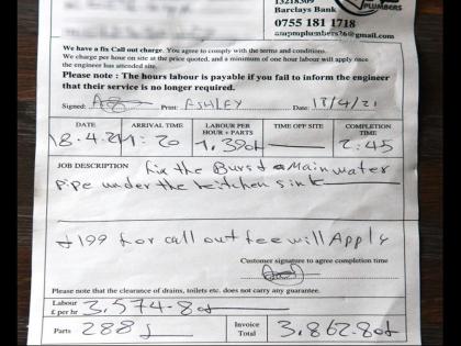 एश्ले हा २३ वर्षांचा असून हँट्समध्ये राहतो. द सनशी बोलताना त्यानं सांगितलं की,'' सुरूवातीला मी पाहिलं किचनमध्ये खूप पाणी जमा झालं आहे. कारण सिंकमध्ये जोडलेला पाईल तुटला होता. त्यामुळे मोठ्या प्रमाणात पाणी बाहेर वाहून येऊ लागलं. त्यानंतर मी पी एम प्लंबर सर्विसच्या मेहदी पैरवी यांना फोन करून बोलावले. सुरूवातीला जेव्हा मी खर्चाबाबत विचारलं तेव्हा काहीच सांगितलं नाही. माझ्या प्रश्नांची उत्तरं न देताच त्यानं काम करायला सुरूवात केली. पण काम पूर्ण झाल्यानंतर त्यानं माझ्याकडून ३९०० पाऊंड्स ( जवळपास ४ लाख रूपये) मागितले. याच किमतीची पावतीसुद्धा माझ्याकडे दिली.''