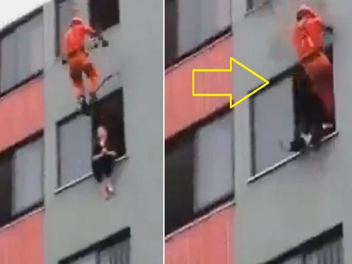 मीडिया रिपोर्ट्सनुसार, महिला आत्महत्या करणार होती आणि खाली लोकांची गर्दी जमा झाली होती. तिला सगळे अडवत होते. व्हिडीओत दिसत आहे की, महिला खिडकीत बसली आहे आणि तिचे दोन्ही पाय खाली लटकत आहेत. तेव्हा फायर बिग्रेडचा एक कर्मचारी दोरीने लटकत खाली येतो.