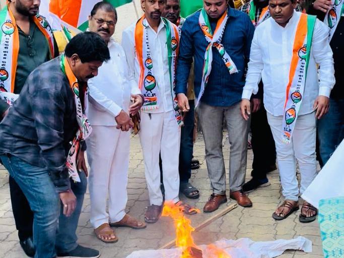 डोंबिवली: कल्याण शिळफाटा येथील गोळवली नाका येथे छत्रपती शिवाजी महाराज यांच्या विषयी अपशब्द वापरणाऱ्या राज्यपाल भगतसिंह कोश्यारी यांच्या विरोधात राष्ट्रवादी काँग्रेसच्यावतीने सोमवारी आंदोलन करून निषेध व्यक्त करण्यात आला. याप्रसंगी राष्ट्रवादी युवक काँग्रेसच्यावतीने राज्यपाल भगतसिंह कोश्यारी यांच्या पुतळ्याचे दहन करण्यात आले. यावेळी कल्याण डोंबिवली जिल्हा कार्याध्यक्ष डॉ. वंडार पाटील उपस्थित होते. ठाणे जिल्हा युवक अध्यक्ष सुधीर वंडार पाटील यांनी निषेध व्यक्त करताना सांगितले की, छत्रपती शिवाजी महाराजांचा अपमान करणाऱ्या भगतसिंह कोश्यारी यांना महाराष्ट्रात राहण्याचा कोणताही अधिकार नाही. हे राज्यपाल नसून भाज्यपाल आहेत. या काळात टोपीच्या मागे काय दडलंय? ही काळी टोपी जाळून आम्ही याचा निषेध करीत आहोत. आज आम्ही शांततेच्या मार्गाने आंदोलन करीत आहोत. जर का या राज्यपाल भगतसिंह कोश्यारींना महाराष्ट्रातून हटवले नाही, तर आम्ही राजभवनावर जाऊन मोठ्या स्वरूपाचे जन आंदोलन करू असा इशारा पाटील यांनी दिला.