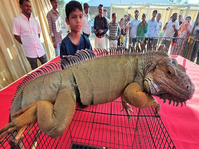कोल्हापूर : कोल्हापुरातील मेरी वेदर मैदानावर खासदार धनंजय महाडिक यांच्या संकल्पनेतून शुक्रवारी माजी आमदार महादेवराव महाडिक यांच्या हस्ते भीमा कृषी व पशू प्रदर्शनाचे उदघाटन करण्यात आले. या प्रदर्शनात पहिल्याच दिवशी पाच फुटांचा इग्वाना सरडा पाहण्यासाठी नागरिकांनी मोठी गर्दी केली होती.