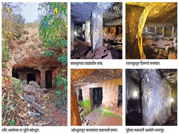 अशी आहे गुहा या गुहेचे अंतगृह वैशिष्ट्यपूर्ण आहे. आत शयनगृह, पाण्याचे कुंड आहे. १२ खांबांचे सभागृह आहे. यातील सहा खांबांची पडझड झाली आहे. प्रत्येक खांब १२ ते १४ फूट उंचीचा व दाेन खांबांत १० फुटांचे अंतर आहे. गुहेपासून २० फुटांवर विहीर आहे, जी आता मुजली आहे.
