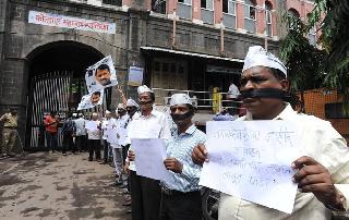 कोल्हापूर, दि. २0 : रस्ते हस्तांतराच्या प्रस्तावाच्या नावाखाली दारु दुकाने पूर्ववत सुरु ठेवण्याचा महानगरपालिकेतील सत्तारुढांचा प्रयत्न सुरु असून त्याला विरोध करण्यासाठी मंगळवारी आम आदमी पार्टीच्यावतीने महासभेवेळी महापालिकेच्या प्रवेशद्वारासमोर तोंडावर काळ्या पट्टी बांधून मुक निदर्शने केली.