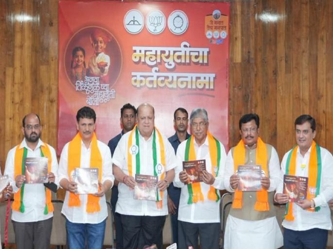 महायुतीच्या जाहीरनाम्यामध्ये शाहीर डफावर थाप मारून पोवाडा सादर करत असल्याचे चित्र मुखपृष्ठावर छापण्यात आले आहे. ‘जे मनात, तेच मनपात’ अशी टॅगलाईन महायुतीने वापरली आहे. लॅपटॉप, फुटबॉल, संक्रातीचा तिळगूळ याचा उल्लेख करत कोल्हापुरी वैशिष्ट्यांची झलक या जाहीरनाम्यात दिसून येत आहे.