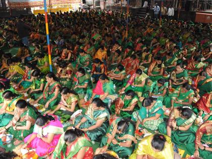 कोल्हापुरातील करवीर निवासिनी अंबाबाई मंदिरातील गारेच्या गणपती चौकात ‘कुंकुमार्चन’ विधी सोहळ्यात महिला भाविक मोठ्या प्रमाणात सहभागी झाल्या होत्या./छाया : आदित्य वेल्हाळ