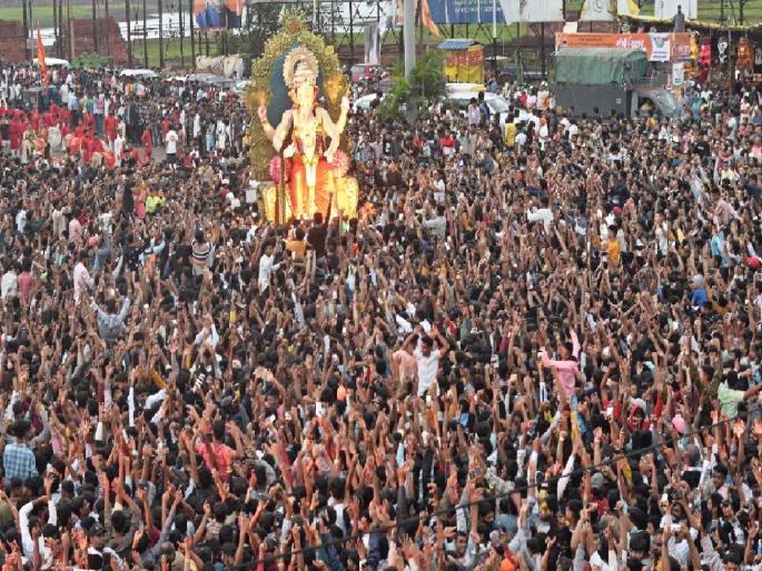 जागा मिळेल तेथे उपस्थितीकोल्हापूरच्या राजा गणेशमूर्तीचे पहिले दर्शन घ्यायचे या उद्देशाने किमान दहा हजारांहून अधिक लोकांनी हजेरी लावली. यात युवक-युवतींचा अधिक समावेश होता. अनेकांनी इमारतीसह बसस्टाॅप शेड आणि दुकानाच्या शेडवर, तर काहींनी गांधीनगर उड्डाणपुलावरील रस्त्यावर बस, ट्रक उभे केले होते. त्यावर धोकादायक उभे राहून हा सोहळा पाहिला.