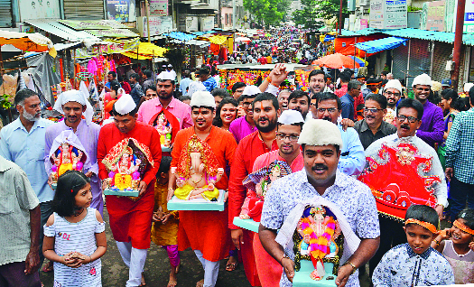 पाना-फुलांनी सजलेल्या हातगाड्या, दुचाकी, चारचाकी, बग्गी, रथ अशा विविध प्रकारच्या वाहनांसह वाद्याच्या गजरात चालत बाप्पांना नेणाऱ्यांची संख्या अधिक होती. दुपारी बारा वाजल्यानंतर मात्र गर्दी कमी झाली. अधून-मधून कोसळणाºया पावसाच्या सरी झेलत भाविकांनी गणपती बाप्पांना घरी नेले.
