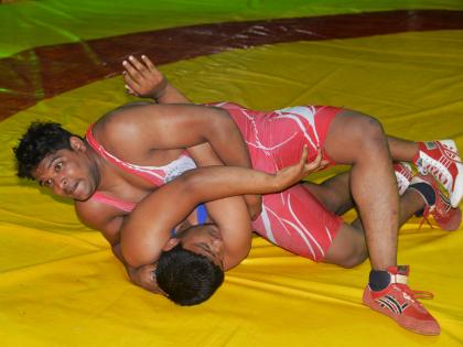 कोल्हापुरातील राजर्षी छत्रपती शाहू खासबाग मैदानात जिल्हा क्रीडा कार्यालयातर्फे आयोजित शालेय राज्यस्तरीय १९ वर्षांखालील मुलांच्या कुस्ती स्पर्धेच्या ग्रीक रोमन प्रकारात १३० किलो गटात दीपक वडसकर (लातूर) व राहुल खरात (पुणे) यांच्यातील लढतीमधील एक क्षण. (छाया : नसीर अत्तार)