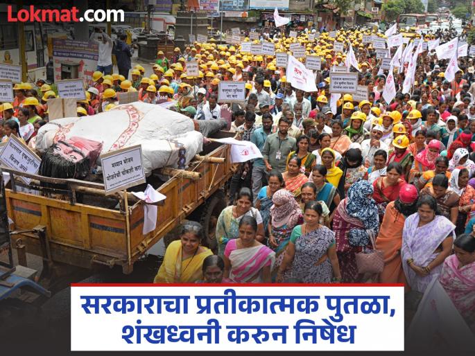 सरकाराचा प्रतीकात्मक पुतळाकामगारांनी मोर्चात ट्रॅक्टरवर राज्य सरकारचा निषेध करण्यासाठी प्रतीकात्मक मोठा पुतळा आणला होता. हा पुतळा ट्रॅक्टरवर झोपवून घोषणा देत निषेध केला.