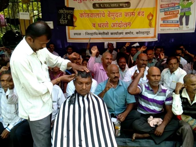 कोल्हापूर : सरकारी सेवेत सामावून घेऊन चतुर्थश्रेणीचा दर्जा द्यावा, या मागणीसाठी कोतवालांचे गेल्या २३ दिवसांपासून जिल्हाधिकारी कार्यालयासमोर धरणे आंदोलन सुरु आहे. अद्यापही शासनाने या आंदोलनाकडे लक्ष दिलेले नाही. त्याच्या निषेधार्थ ३० हून अधिक कोतवालांनी आंदोलनस्थळी सामुदायिक मुंडण करुन निषेध केला. लवकर दखल न घेतल्यास तीव्र आंदोलनाचा इशाराही त्यांनी यावेळी दिला.