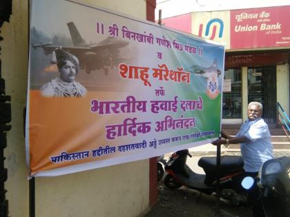 भारतीय वायूसेनेने पाकिस्तानमध्ये सैनिकी कारवाई केल्यानंतर मंगळवारी कोल्हापुरातील बिनखांबी गणेश मंदिर परिसरात भारतीय वायूदलाचे अभिनंदन करणारा असा फलक लगेच झळकला.