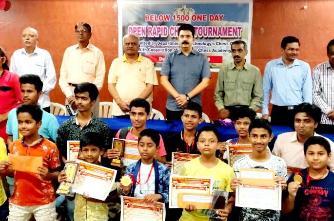 कोल्हापूर : डिपार्टमेंट आॅफ टेक्नॉलॉजी चेस क्लब व कोल्हापूर चेस अकॅडमीतर्फे घेण्यात आलेल्या पंधराशे गुणांकनाखालील खुल्या जलद बुद्धिबळ स्पर्धेत सातवा मानांकित कोल्हापूरच्या सोहम खासबारदारने आठपैकी आठ गुण मिळवून अजिंक्यपद, तर साताऱ्याच्या ज्योतिरादित्य जाधवने सात गुण मिळवून उपविजेतेपद पटकाविले.शिवाजी विद्यापीठ तंत्रज्ञान विभागात झालेल्या या स्पर्धेत खुल्या गटात सोहम खासबारदार (कोल्हापूर), ज्योतिरादित्य जाधव (सातारा), प्रणव पाटील (कोल्हापूर), अभिषेक पाटील, अनिकेत बापट (सातारा), श्रुती गुरव (कोल्हापूर), मयांक च्युलेट (बेळगाव), अनिकेत रेडीज (रत्नागिरी), आयुष महाजन (कोल्हापूर), सिद्धेश यादव (सांगली).बिगरमानांकित गटात सनमित शहा (सांगली), आकाश शेवते (वाई), नीलेश पुजारी (बेळगाव), शुभम कांबळे (इचलकरंजी), सुरेश भोसले (सातारा), कुणाल सपकाळ (सातारा), तीर्थलिंग शेफाली (रायगड), रेहान महात (सांगली), राहुल शहा (बेळगाव), संकेत नाटेकर (सांगली).गुणांकन १००० ते ११५० गटात यश पंढरपुरे (सांगली, तुषार घुणके (कारदगा), सम्मेद पाटील (इचलकरंजी), समृद्धी कुलकर्णी (कोल्हापूर), श्रावणी बोरकर (कोल्हापूर), गुणांकन ११५१ ते १३०० गटात शर्विल पाटील, वरद आठल्ये (कोल्हापूर), संकेत महाडेश्वर (सिंधुदुर्ग), ईशा कोळी (सातारा), सारंग पाटील (कोल्हापूर) यांचा समावेश आहे.उत्कृष्ट बुद्धिबळपटू बी. एस. नाईक (कोल्हापूर), दिलीप कुलकर्णी (सांगली), पूर्वा सप्रे, रजनी झांबरे (कोल्हापूर), मयूरी सावळकर, तृप्ती प्रभू, अथर्व चव्हाण, स्वप्निल गुडघे, रितेश केसरे, सय्यद अमीन, प्रज्ज्वल जोशी, हृषिकेश तिबिले, कौस्तुभ गोते, पार्थ मकोटे. सर्वांत लहान बुद्धिबळपटू म्हणून मिहीर शहा, मनवा देशपांडे यांचा गौरव करण्यात आला.स्पर्धेचा बक्षीस समारंभ प्रवीण शहा, अजितसिंह काटकर यांच्या हस्ते झाला. यावेळी भरत पाटोळे, बी. एस. नाईक, दयानंद साजन्नावर, महिपाल मिरजे, भरत चौगुले, मनीष मारुलकर, उत्कर्ष लोमटे, प्रीतम घोडके, पुष्कर जाधव, ऋतुराज भोकरे, आदी उपस्थित होते.