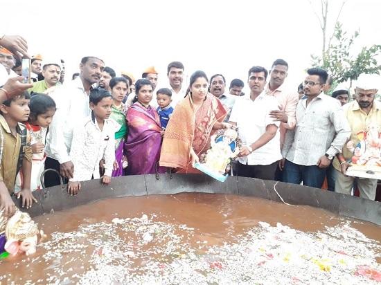पर्यावरण पूरक गणेशोत्सव उपक्रमातंर्गत कळंबा येथे जिल्हा परिषदेच्या अध्यक्षा शौमिका महाडिक यांच्या हस्ते काहिलीमध्ये गणेश मूर्तीचे विसर्जन करण्यात आले.