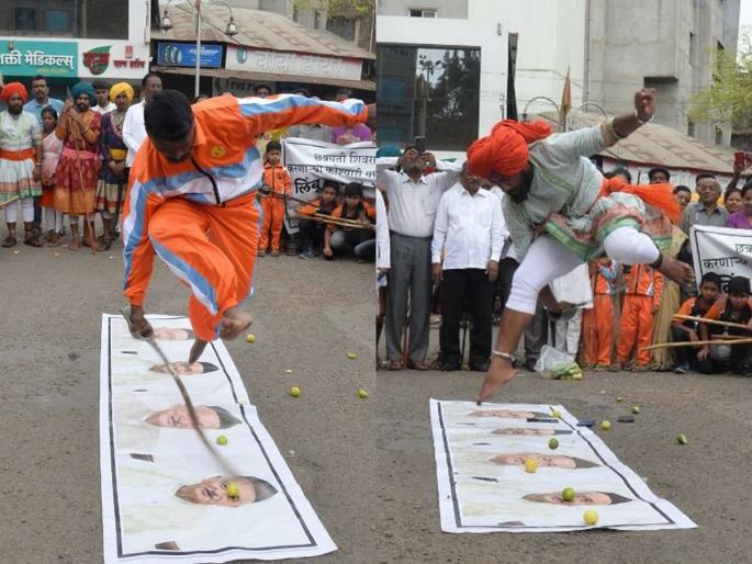 कोल्हापूर : छत्रपती शिवरायांचा अवमान करणारे भगतसिंग कोश्यारी यांची राज्यपालपदावरुन हकालपट्टी करा, या मागणीसाठी शिवभक्त लोकआंदोलन समिती आणि कोल्हापूर जिल्हा दांड-पट्टा,लाठी असोसिएशनने रविवारी अनोखे लिंबूमार आंदोलन केले. यावेळी शिवाजी पेठेतून काढण्यात आलेल्या निषेध मोर्चाला मोठा प्रतिसाद मिळाला.