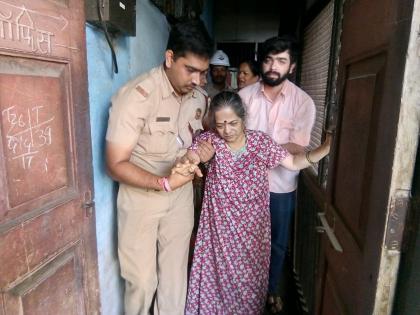 इमारतीमध्ये अडकलेल्या वृद्धेला सुखरूप बाहेर काढताना अग्निशामक दलाचे जवान.