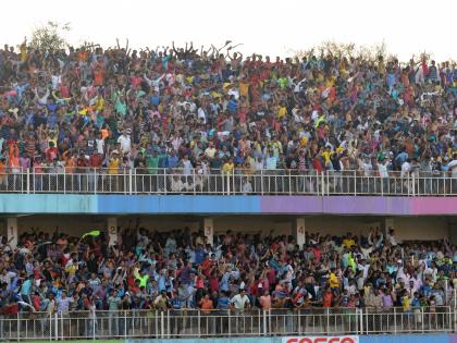 छत्रपती शाहू स्टेडियमवर कोल्हापूर स्पोर्टस् असोसिएशन आयोजित केएसए वरिष्ठ गट फुटबॉल सामन्यात ‘हाय व्होल्टेज’ सामना असल्याने फुटबॉलप्रेमींनी स्टेडियमवर मोठी गर्दी केली होती. (छाया : नसीर अत्तार)