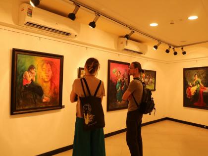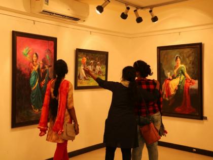 कोल्हापूरचा युवा चित्रकार स्वप्निल पाटील यांच्या मुंबईतील चित्रप्रदर्शनाला सोमवारी अनेकांनी भेट दिली.