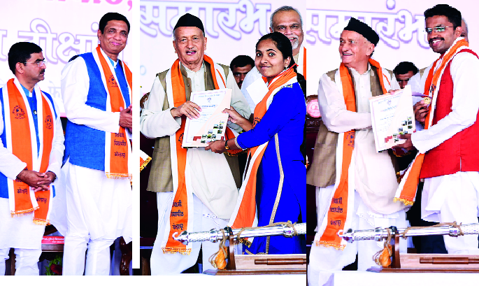 कोल्हापुरात गुरुवारी शिवाजी विद्यापीठाच्या ५६ व्या दीक्षान्त समारंभात राज्यपाल भगतसिंह कोश्यारी यांच्या हस्ते कोल्हापुरातील अभिषेक दादासाहेब श्रीराम याला विद्यापीठाच्या सर्वसाधारण कौशल्यासाठीचे राष्ट्रपती सुवर्णपदक, तर सातारा येथील कीर्ती दत्तात्रय ननवरे हिला एम. ए. संस्कृत विषयात सर्वाधिक गुण मिळविल्याबद्दल कुलपती पदक देऊन सन्मानित करण्यात आले. यावेळी डावीकडून विलास नांदवडेकर, देवानंद शिंदे, भूषण पटवर्धन उपस्थित होते.