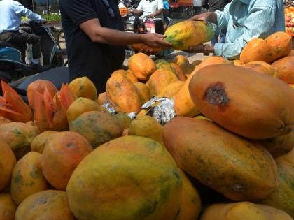 रविवारच्या आठवडी बाजारात पिवळीधमक व चवीला गोड अशी पपई आली आहे. तिच्या खरेदीसाठी बाजारात गर्दी होती.(छाया : नसीर अत्तार)