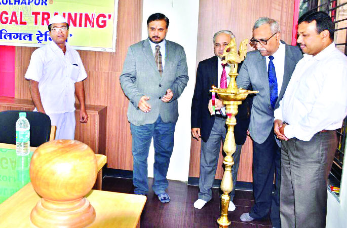 कोल्हापूर जिल्हा न्याय व विधि सेवा प्राधिकरणाच्यावतीने सोमवारी जिल्हा न्यायालयात आयोजित विधि स्वयंसेवक प्रशिक्षण शिबिराचे उद्घाटन करताना प्रमुख जिल्हा न्यायाधीश एम. ए. लव्हेकर. डावीकडून विधि प्राधिकरणाचे सचिव उमेशचंद्र मोरे, विवेक शुक्ल, प्रशांत शिंदे.