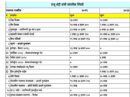 २०१९ साली राजू शेट्टी यांची एकूण मालमत्ता २ कोटी ३६ लाख ४७ हजार ३३३ रुपये होती. आता म्हणजे २०२४ साली तीच मालमत्ता २ कोटी ८१ लाख ३४ हजार ८८६६ रुपये एवढी झाली आहे. या मालमत्ता वाढीची कारणंही राजू शेट्टी यांनी प्रतिज्ञापत्रात नमूद केली आहेत.