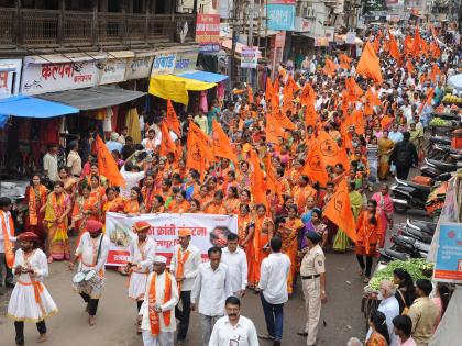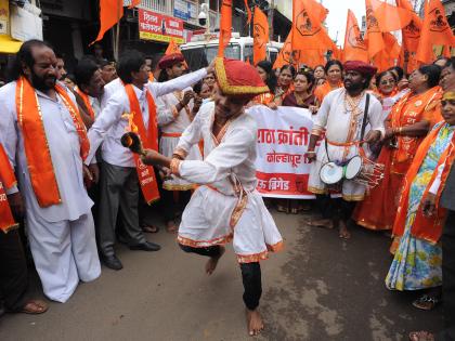 येथून समोर हातात चौंडकं, संबळ घेतलेले गोंधळी मागे शेकडो कार्यकर्ते हातात भगवे झेंडे, डोक्यावर भगवी टोपी, गळ््यात भगवे स्कार्फ तर भगव्या साड्या परिधान केलेल्या महिला पायी अंबाबाई मंदिराकडे निघाले.