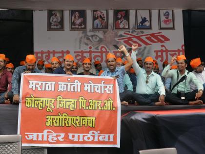 मराठा आरक्षण मागणीसाठी सकल मराठा क्रांती ठोक मोर्चातर्फे कोल्हापुरातील दसरा चौकात सुरू असलेल्या ठिय्या आंदोलनात शुक्रवारी कोल्हापूर जिल्हा पीआरओ असोसिएशनने सहभागी होऊन पाठिंबा दिला. (छाया : नसीर अत्तार)