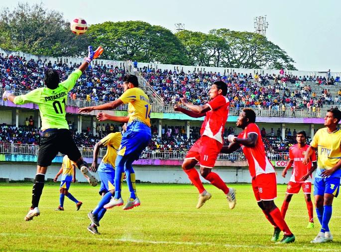छत्रपती शाहू स्टेडियमवर केएसए फुटबॉल लीग स्पर्धेत सोमवारी झालेल्या सामन्यात फुलेवाडी फुटबॉल क्रीडा मंडळ विरुद्ध पाटाकडील तालीम मंडळ यांच्यामध्ये झालेल्या सामन्यातील एक क्षण.