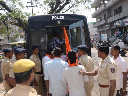 इचलकरंजीत पद्मावत चित्रपटाचा खेळ बंद पाडण्यासाठी आंदोलन करणाऱ्यांना पोलिसांनी ताब्यात घेतले. (छाया : उत्तम पाटील)