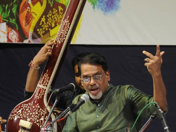 राम गणेश गडकरी हॉलमध्ये ब्राह्मण सभा करवीर (मंगलधाम) आयोजित पं. सुधाकरबुवा डिग्रजकर स्मृती संगीत महोत्सवात पं. विनोद डिग्रजकर यांचे गायन झाले. (छाया : आदित्य वेल्हाळ)