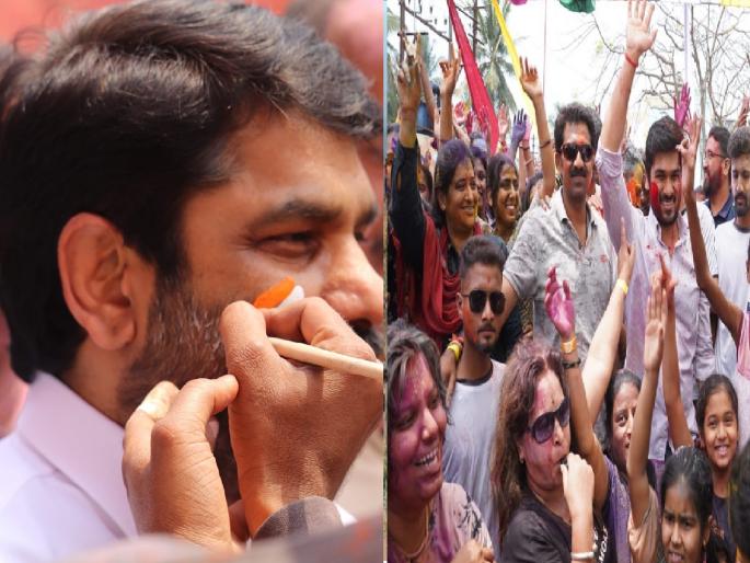 कळंबा : गृहराज्यमंत्री सतेज पाटील यांनी उत्तरच्या राजकीय धुळवडीतुन वेळात वेळ काढत शारंग महोत्सवात हजेरी लावून तरुणाईला रंगपंचमीच्या शुभेच्छा दिल्या. यावेळी महिलांच्या आग्रहाखातर मंत्री पाटील यांनी फेस पेंटिंग करून घेत चेहऱ्यावर दोन्ही बाजूंना तिरंगा काढून रंगपंचमीचा आनंद घेतला. तर दक्षिणचे युवा आमदार आमदार ऋतुराज पाटील यांनी डी.जे च्या गाण्यावर ठेका धरला. यावेळी महिला युवतींच्या जल्लोषाला एकच उधाण आले.क्रेशर चौकात आयोजित शारंग महोत्सवात दक्षिणचे युवा आमदार ऋतुराज पाटलांचे दुपारी बारा वाजता आगमन होताच युवतींची सेल्फी घेण्यासाठी झुंबड उडाली. कोरड्या रंगाची उधळण, रेनडान्स आणि डी जे च्या तालावर महिलांना मनमुराद आनंद घेताना पाहताच आपसूकच आमदार ऋतुराज पाटील यांनीही गाण्यावर ठेका धरला.काही वेळानंतर याठिकाणी गृहराज्यमंत्री सतेज पाटील यांचीही एंट्री झाली. मंत्री पाटील यांचे आगमन होताच पुन्हा उत्साहास उधाण आले आणि रंगपंचमीचा ज्वर शिगेला पोहोचला. गृहराज्यमंत्र्यांनी कोरोना नंतर आलेल्या रंगपंचमीच्या उत्सवाच्या शुभेच्छा देत महिलांच्या आग्रहाखातर फेस पेंटिंग करून घेतले. चेहऱ्यावर दोन्ही बाजूंना तिरंगा काढून घेत यावेळी रंगपंचमीचा आनंद घेतला.कोरोना महामारीच्या दोन वर्षांच्या अंतानंतर यंदाची ही रंगपंचमी मोठ्या उत्साहात साजरी झाली. शारंग महोत्सवात तर तरुणाईने उच्चांकी गर्दी केली होती. यावेळी पुष्पा चित्रपटातील गाण्यांवर बेभान होऊन नाचत महिलांनी रंगपंचमीचा आनंद लुटला. त्यांना साथ दिली निवेदिका मोनिका जाजू आणि डी जे स्टेला मसिन यांनी. यावेळी महिलांसाठी डान्स, उखाणे, फेसपेंटिंग आदी आकर्षक पारितोषिकांच्या स्पर्धेचे आयोजन करण्यात आले होते.माजी नगरसेविका दीपा मगदूम, शोभा कवाळे, पूजा नाईनकवरे, मेहजबिन सुभेदार, प्रमिला देशमुख, प्रीती देशमुख यांच्या समवेत रंगपंचमीचा कारेक्रमाचा परिसरातील सुमारे हजारावर महिलांनी आनंद घेतला.