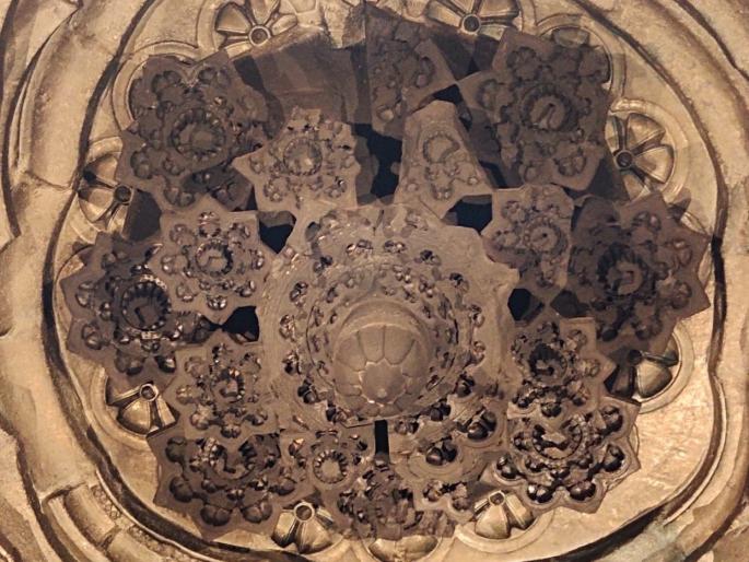 कोल्हापूर : करवीर निवासिनी श्री अंबाबाई मंदिराच्या छताला लावण्यात आलेले ३ टन वजनाचे लोखंडी गज गुरुवारी काढून टाकण्यात आले, त्यामुळे मंदिराच्या मूळ ढाच्यातच असलेले व वास्तुकलेचा सुंदर नमुना असलेले ६ फूट रुंद व ५ फूट उंच असलेले दगडी झुंबर पहिल्यांदा प्रकाशात आले आहे. या झुंबरचे सौंदर्य दिसावे यासाठी स्वतंत्र विद्युत व्यवस्था करण्यात आली आहे.