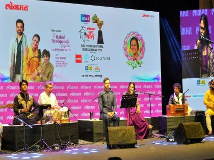कोल्हापूर - तुडुंब भरलेल्या रसिक प्रेक्षकांच्या साक्षीने पंडित विनोद डिग्रजकर आणि विदुषी मंजूषा कुलकर्णी-पाटील यांना शनिवारी (दि. २८) सायंकाळी ‘सूर ज्योत्स्ना’ राष्ट्रीय पुरस्काराने येथे सन्मानित करण्यात आले. खासदार शाहू छत्रपती, पालकमंत्री प्रकाश आबिटकर, ग्रामविकासमंत्री जयकुमार गोरे आणि लोकमत मीडिया ग्रुपचे चेअरमन डॉ. विजय दर्डा यांच्या हस्ते या द्वयींचा सन्मानचिन्ह, मानपत्र देऊन गौरव करण्यात आला. ‘आनंद भवन’मध्ये झालेल्या या दोन्ही कलाकारांच्या योगदानाचा गौरव होताना रसिकांना टाळ्यांच्या कडकडाटात जणू काही मानवंदनाच दिली. ‘सूर ज्योत्स्ना’ पुरस्कार जगण्याची ऊर्जा वाढवणारा असल्याची भावना पुरस्कार विजेत्यांनी व्यक्त केली.