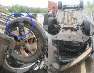 टायर फुटल्याने कार उलटली, सुदैवाने कार चालक बचावला