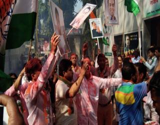 महाराष्ट्र : तीन राज्यांतील निवडणुकीत मिळत असलेल्या यशानंतर काँग्रेस कार्यकर्त्यांचा जल्लोष