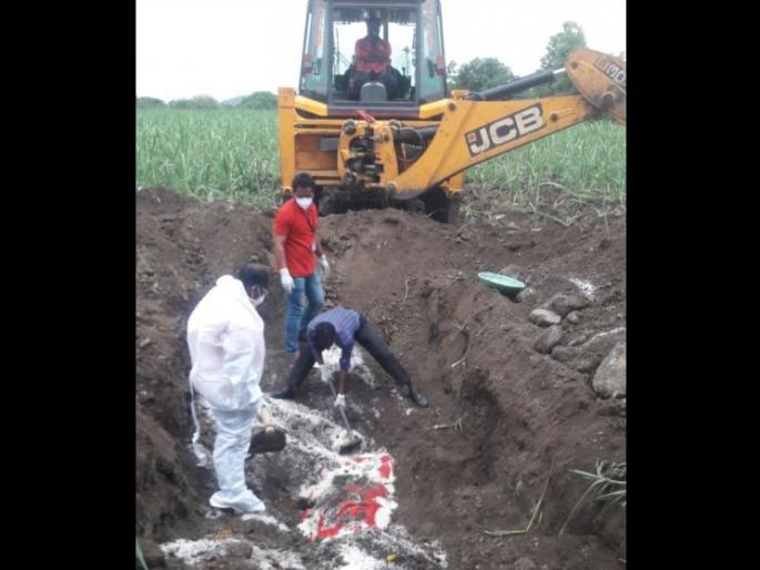 लातूर- मृतदेहाची अदलाबदल झाल्याचे समजल्यानंतर अंत्यसंस्कार झालेले पार्थिव पुन्हा जमिनीतून बाहेर काढण्यात आले आणि ते संबंधित नातेवाईकांच्या ताब्यात देण्यात आले. या प्रकारामुळे एकाच पार्थिवावर दोन वेळा अंत्यसंस्कार करावे लागले. ही घटना गुरुवारी येथे घडली. (CoronaVirus exchange of corpses; After the funeral, JCB had to take dead body out)