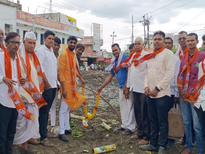 अहमदपूर : शहरातील बसस्थानक परिसरात घाणीचे साम्राज्य आहे. तेथील सांडपाणी रस्त्यावर येत असल्याने ये- जा करताना नागरिकांना त्रास सहन करावा लागत आहे. याकडे प्रशासनाचे लक्ष वेधण्यासाठी मनसेच्या वतीने खड्ड्यांस फुलांचा हार घालून सोमवारी आंदोलन करण्यात आले.