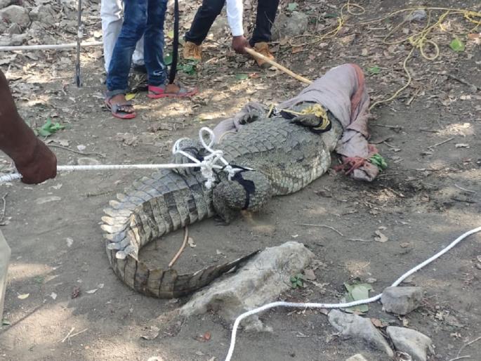 सध्या तलावात पाण्याचे डबके शिल्लक राहिले आहे. त्यामुळे बुधवारी मगर पाण्याबाहेर पडली. ती तलावाच्या सांडव्यात ओलसर थंड जागेवर असल्याचे परिसरातील शेतकऱ्यांनी पाहिले. त्यानंतर ग्रामस्थांनी मगर पाहण्यासाठी एकाच गर्दी केली. दरम्यान, उपसरपंच प्रवीण जगताप यांनी वनविभागास याची माहिती दिली. उदगीरचे वनपरिमंडळ अधिकारी रामेश्वर केसाळे, चाकूर येथील वनपरिमंडळ अधिकारी सुरेश मस्के, वनरक्षक बी.एच. गडकर, विश्वनाथ होनराव यांनी मगरीला पकडून सुरक्षितस्थळी सोडले. दरम्यान, या साठवण तलावातील शिल्लक पाण्यात आणखी एक मगर असल्याची चर्चा ग्रामस्थांमध्ये आहे.