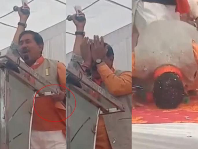 येथील पोहरा विधानसभा मतदारसंघातून निवडणूक लढवणाऱ्या शिंदे समर्थक आमदार आणि राज्यमंत्री असलेल्या सुरेश धाकड यांनी जनसभेला संबोधित करताना चक्क शर्टाचा पदर लोकांपुढे पसरला होता. यावेळी, बोलताना त्यांच्या डोळ्यातही पाणी आलं. मी तुमच्याकडे मतांची भीक मागत आहे, असे म्हणत त्यांनी व्यासपीठावरच साष्टांग दंडवत घेतला.