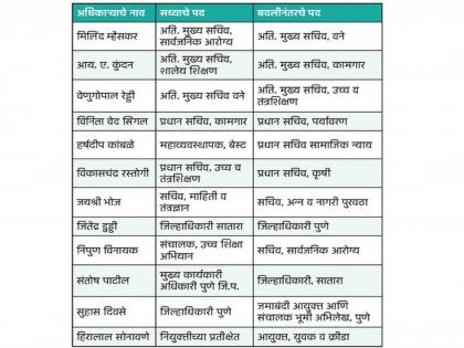 उद्योग विभागाचे प्रधान सचिव हर्षदीप कांबळे आता सामाजिक न्याय विभागाचे प्रधान सचिव असतील. कामगार विभागाच्या प्रधान सचिव विनिता वेद सिंघल आता पर्यावरण विभागाच्या प्रधान सचिव असतील. उच्च व तंत्रशिक्षण विभागाचे प्रधान सचिव विकासचंद्र रस्तोगी हे आता याच पदावर कृषी विभागात बदलून गेले आहेत. उच्च शिक्षा अभियानाचे संचालक निपुण विनायक हे सार्वजनिक आरोग्य विभागाचे नवीन सचिव असतील.