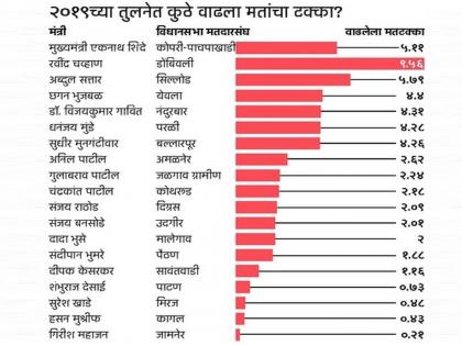 ज्या मंत्र्यांच्या विधानसभा मतदारसंघात मतदान वाढले त्यात रवींद्र चव्हाण हे टॉपवर आहेत. अब्दुल सत्तार, मुख्यमंत्री एकनाथ शिंदे, छगन भुजबळ, डॉ. विजयकुमार गावित हे टॉप फाइव्हमध्ये आहेत. मतदानाचा टक्का घसरलेल्या मंत्र्यांमध्ये दिलीप वळसे-पाटील, मंगलप्रभात लोढा, राधाकृष्ण विखे पाटील, उदय सामंत, अतुल सावे यांचा पहिल्या पाचांत समावेश आहे. नंदुरबारमध्ये डाॅ. विजयकुमार गावित यांच्या कन्या डॉ. हीना या भाजपच्या उमेदवार आहेत. विखे पाटील यांचे पुत्र डाॅ. सुजय हे अहमदनगरमधून लढत आहेत; पण विखे यांचा मतदारसंघ शिर्डी लोकसभा मतदारसंघात येतो.