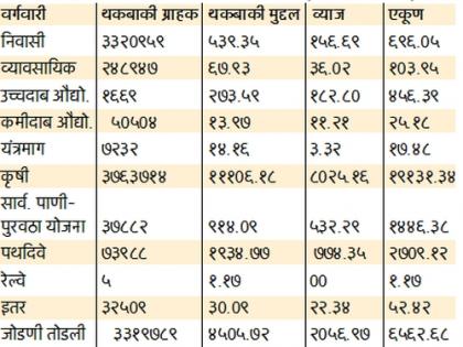 कृषी वीज थकबाकीदारांची जिल्हावार थकबाकी (आकडे कोटी रु.मध्ये) अकोला २४८, बुलडाणा ७५४, वाशिम २९३, अमरावती ६३९, यवतमाळ ७२३, औरंगाबाद १३१९, जालना ९३१, सातारा १७९, सोलापूर २०९७, ठाणे ०.६२, चंद्रपूर ३३ भंडारा ६० गडचिरोली २२, गोंदिया ३५, धुळे ५८४, जळगाव १५११, नंदुरबार ३४८, पालघर ३, रायगड १.२५, रत्नागिरी ०.३९, सिंधुदुर्ग ०.३२, कोल्हापूर ७९, सांगली ३५४, बीड १०८६, लातूर ६९९, उस्मानाबाद ८७२, नागपूर २०५, वर्धा ८६, हिंगोली ४८७, नांदेड ८७१, परभणी ७१८, अहमदनगर २०८१, नासिक ८८९, पुणे ९१५.