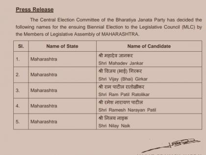 मुंबई : राज्य विधान परिषदेच्या 11 जागांसाठी होणारी निवडणूक बिनविरोध होण्याची शक्यता आहे. विधान परिषद निवडणुकीसाठी भाजपानं उमेदवारांची घोषणा केली आहे. भाजपाकडून महादेव जानकर, भाई गिरकर, राम पाटील रातोळीकर, रमेश नारायण पाटील व नीलय नाईक यांना उमेदवारी जाहीर करण्यात आली आहे.