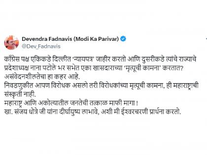 देवेंद्र फडणवीस म्हणाले की, काँग्रेस पक्ष एकीकडे दिल्लीत ‘न्यायपत्र’ जाहीर करतो आणि दुसरीकडे त्यांचे राज्याचे प्रदेशाध्यक्ष नाना पटोले भर सभेत एका खासदाराच्या ‘मृत्यूची कामना’ करतात?. असंवेदनशीलतेचा हा कहर आहे. निवडणुकीत आपण विरोधक असलो तरी विरोधकांच्या मृत्यूची कामना, ही महाराष्ट्राची संस्कृती नाही. महाराष्ट्र आणि अकोल्यातील जनतेची तात्काळ माफी मागा अशी मागणी करत खा. संजय धोत्रे यांना दीर्घायुष्य लाभावे, अशी मी ईश्वरचरणी प्रार्थना करतो असं त्यांनी ट्विटद्वारे सांगितले.