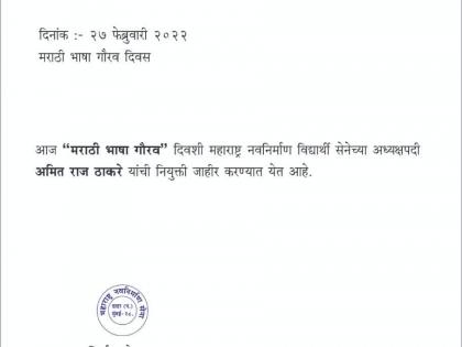 आज सकाळी मनसेच्या मुंबईतील राजगड या मध्यवर्ती कार्यालयाने एक पत्रक प्रसिद्ध करून या संदर्भातील घोषणा केली आहे. आज मराठी भाषा गौरव दिवशी महाराष्ट्र नवनिर्माण विद्यार्थी सेनेच्या अध्यक्षपदी अमित राज ठाकरे यांची नियुक्ती जाहीर करण्यात येत आहे, असे या पत्रकात म्हटले आहे. या निवडीमुळे पुढच्या काळात अमित ठाकरे हे मनसेमध्ये अधिक सक्रिय झालेले दिसू शकतात.