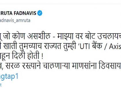यासंदर्भात, अमृता फडणवीस यांनी एक ट्विट करत, "ए भाई , तू जो कोण असशील - माझ्या वर बोट उचलायचं न्हाय ! पोलिसांची खाती तुमच्याच राज्यत तुम्ही ‘UTI बैंक / Axis बैंक ‘ ला योग्यता पाहून दिली होती! लक्षात ठेव, सरळ रस्त्याने चालणाऱ्या माणसांना डिवसायचे न्हाय!" असे म्हटले आहे.