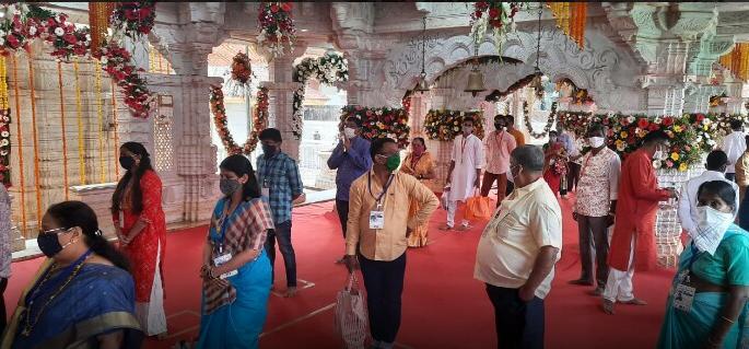 गर्दी मर्यादित असल्याने दोन रांगांद्वारे देवीचे दर्शन देण्यात आले. तर तुलाभार करण्यासाठी वेगळ्या रांगेची व्यवस्था करण्यात आली आहे.यावर्षी कोरोनाच्या पार्श्वभूमीवर होणाऱ्या जत्रोत्सवासाठी प्रशासनाने कडक निर्देश घातल्याने केवळ आंगणे कुटुंबीय व नातेवाईक यांनी देवीचे दर्शन घेतले.दरवर्षी मोड जत्रे दिवशी म्हणजे यात्रेच्या दुसऱ्या दिवशी देवीचे दर्शन घेऊन ओटी भरणाऱ्या आंगणे ग्रामस्थांनी प्रथमच सहकुटुंब मुख्य उत्सवाच्या दिवशी देवीचे दर्शन घेतले. पोलिसांकडून आंगणेवाडीत प्रवेश करणाऱ्या मुख्य तीन मार्गांवर बॅरिकेट्स उभारून केवळ आंगणे कुटुंबीय पास ओळखपत्र असलेल्यानाच आंगणेवाडीत प्रवेश देण्यात येत होता. आरोग्य विभागाकडून यात्रेकरू भाविकांची आरोग्य तपासणी करूनच देवालयात प्रवेश देण्यात येत आहे.शासनाचे निर्देश पाळणे आवश्यक असल्याने यावर्षी देवीच्या भक्तांनी घरीच थांबून आई भराडी मातेचे मनोभावे स्मरण करावे. देवी भराडी तुमच्या मनोकामना निश्चित पूर्ण करेल. त्यामुळे भक्तांनी आज शनिवारी व रविवारी असे दोन दिवस आंगणे कुटुंबियांना सहकार्य करण्याचे आवाहन आंगणे कुटुंबियांच्या वतीने मंडळाचे अध्यक्ष भास्कर आंगणे यांनी केले आहे.