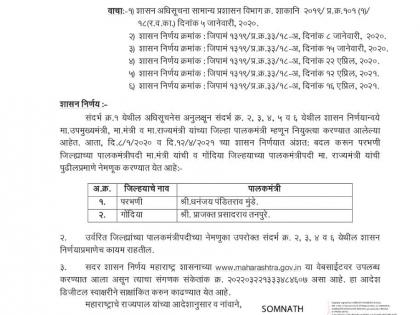 नवाब मलिक परभणी जिल्ह्याचे पालकमंत्री होते, पण आता जिल्ह्याचे पालकमंत्रिपद राष्ट्रवादीचे नेते आणि सामाजिक न्यायमंत्री धनंजय मुंडे यांच्याकडे सोपवण्यात आले आहे. मुंडे यांच्याकडे सध्या बीडचे पालकमंत्रिपद असून, आता त्यांच्यावर परभणीची जबाबदारी सोपवण्यात आली आहे. आज याबाबत शासन निर्णय जारी करण्यात आला असून, यात गोंदियाच्या पालकमंत्रिपदी प्राजक्त तनपुरे यांची नियुक्ती करण्यात आली आहे.